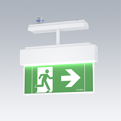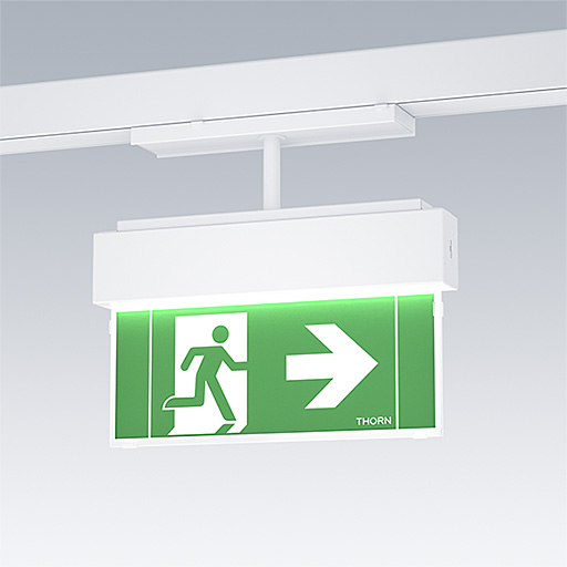 LED safety sign luminaire for tool free mounting on Thorn Contus track system. Sign rotatable and fixable in 45° steps.