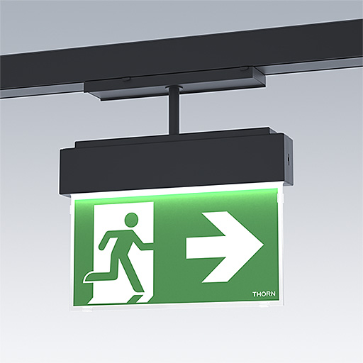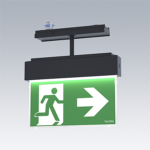 LED safety sign luminaire for tool free mounting on Thorn Contus track system. Sign rotatable and fixable in 45° steps.