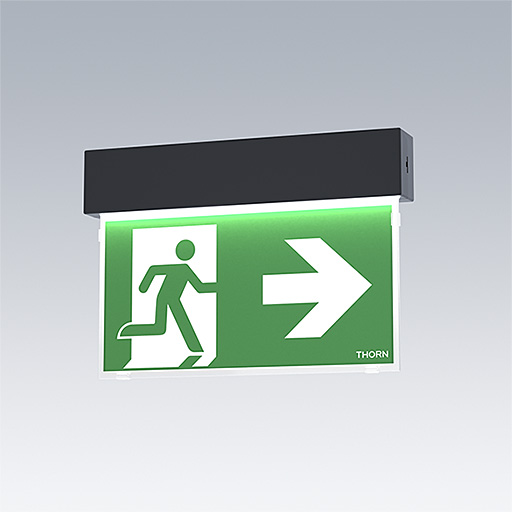 LED Escape sign luminaire for surface, wall or ceiling mounting; Luminaire for central emergency light supply, for single luminaire monitoring via Powerline in connection with the eBox system, addressing and non-maintained/maintained mode setting possible via eBox system, maintained mode as default. , housing made of polycarbonate black, injection moulded; luminaire easy to install; Quick fit terminal block, through wiring possible up to 2,5 mm²; supplied with a set of ISO 7010 mountable direction signs (left, right, up, down and blank) for viewing from a maximum distance of 30 m; zero maintenance thanks to LED technology; service life of 50,000 h at constant luminous flux; uniform backlighting of pictogram; luminance > 500 cd/m² in the white region acc DIN4844. Power supply: 220/240 V AC (+/- 10%) 50/60Hz; 176-280 V DC; Luminaire input power: 3 W; degree of protection: IP40, class of protection: Class II electrical; Impact strength: IK03; ambient temperature: 0°C to +40°C dimensions of luminaire including escape sign: Dimensions: 330 x 45 x 225 mm; weight: 0.63 kg