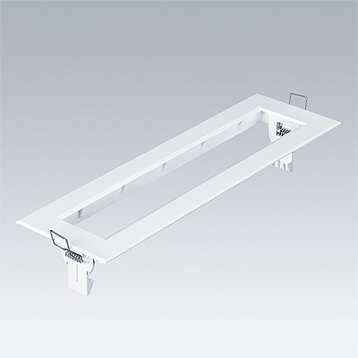 Frame to adapt VOYAGER One surface mounted luminaire to recessed version. Mounting of frame without tools.