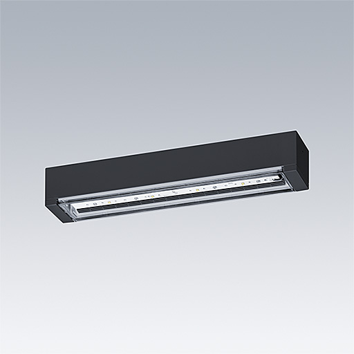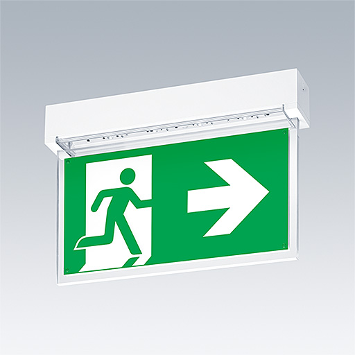 Slim IP65 LED emergency lighting luminaire for surface, wall or ceiling mounting; Click adapter for wall surface mounting within scope of delivery; recessed ceiling mounting possible with optional recessed ceiling frame; Luminaire for central emergency light supply, with circuit monitoring, without single monitoring of the luminaire; high performance (HP) version enables wider luminaire spacing and applications with higher illuminances (e.g. 5 lux, 1 footcandle); ; Cable length from emergency power source to last luminaire: 300 m; additional click-optics optimised for escape routes and open areas from higher mounting heights available; Click in legends for viewing from a maximum distance of 23 m and 30 m available to convert to escape sign luminaire; housing made of polycarbonate black; cover mode of transparent polycarbonate; Tool-less 'click' mounting after fitting the housing base; Quick fit terminal block, through wiring possible up to 2,5 mm²; zero maintenance thanks to LED technology; service life of 50,000 h at constant luminous flux; Power supply: 220/240 V AC; Luminaire input power: 5.6 W; degree of protection: IP65, class of protection: SC2; Impact strength: IK03; Dimensions: 336 x 54 x 59 mm; weight: 0.61 kg