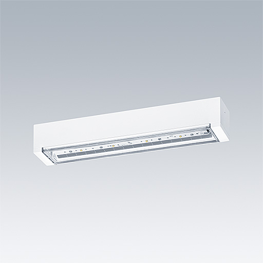 Slim IP65 LED emergency lighting luminaire for surface, wall or ceiling mounting; Click adapter for wall surface mounting within scope of delivery; recessed ceiling mounting possible with optional recessed ceiling frame; Luminaire for central emergency light supply, with circuit monitoring, without single monitoring of the luminaire; high performance (HP) version enables wider luminaire spacing and applications with higher illuminances (e.g. 5 lux, 1 footcandle); ; Cable length from emergency power source to last luminaire: 300 m; additional click-optics optimised for escape routes and open areas from higher mounting heights available; Click in legends for viewing from a maximum distance of 23 m and 30 m available to convert to escape sign luminaire; housing made of polycarbonate white; cover mode of transparent polycarbonate; Tool-less 'click' mounting after fitting the housing base; Quick fit terminal block, through wiring possible up to 2,5 mm²; zero maintenance thanks to LED technology; service life of 50,000 h at constant luminous flux; Power supply: 220/240 V AC; Luminaire input power: 5.6 W; degree of protection: IP65, class of protection: SC2; Impact strength: IK03; Dimensions: 336 x 54 x 59 mm; weight: 0.6 kg