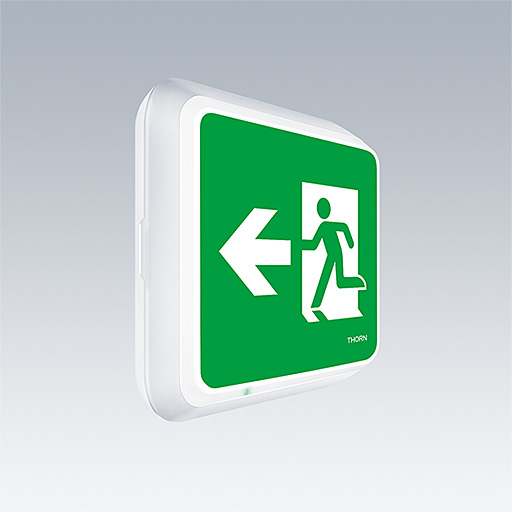 A slim, square, surface mounted, LED safety sign luminaire. Luminaire with local battery supply for 1 h emergency lighting in maintained or non-maintained mode, with automatic test (auto-test) via the luminaire, optional central monitoring via DALI, display of luminaire status via status LED. NFC interface for addressing, configuration and maintenance via PROset Pen (article: 22170290) or PROset app, addressing also alternatively possible visually or via EZ-addressing. Non-maintained and maintained mode settable via jumper and NFC interface (for Autotest luminaires, in case of DALI controlled luminaires to be done over the system). Power supply: 220-240 Vac (± 10%), 50/60 Hz. Body: injection moulded polycarbonate, white (RAL 9016). Diffuser: opal polycarbonate, with glued, printed emergency exit direction arrow (left) pictogram according to ISO 7010. Uniform backlighting of pictogram, luminance > 500 cd/m² in the white region and 200 cd / m² on average in mains mode (according to DIN 4844), 2 cd / m² minimum in emergency mode (according to EN 1838). Recognition distance according to EN 1838: 44m. Class II electrical, IP65, Impact strength: IK10. ambient temperature: 0°C to +35°C. Suitable for direct mounting to wall. Loop-in, loop-out is possible for cables up to 2.5 mm². BESA compatible. Lithium iron phosphate battery (LFP) with 3 years guarantee. Food certificate (to be used in areas with fully packaged food). Luminaire wired with halogen free and silicone free leads. Luminaire with D symbol (for use in environments in which the accumulation of conductive dust on the luminaire can be expected).
