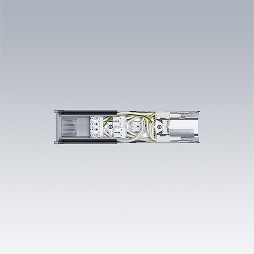 Electrical feed-out, black. Roll-formed sheet steel for electrical conection of continous row system. Plug-in connecting terminals for 5 mains cables, 2 x 2 emergency lighting cables and 2 control lines. End caps included.
