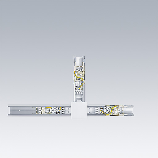 T shaped mechanical and electrical connector, white. Features one female and two male ends for mechanical connection and 3 groups of terminal blocks for electrical feed in, or feed out.