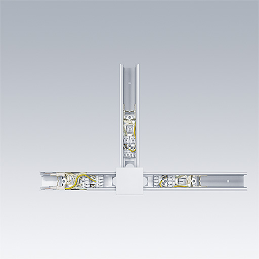 T shaped mechanical and electrical connector, white. Features two female and one male end for mechanical connection and 3 groups of terminal blocks for electrical feed in, or feed out.