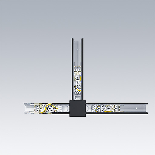 T shaped mechanical and electrical connector, black. Features two female and one male end for mechanical connection and 3 groups of terminal blocks for electrical feed in, or feed out.