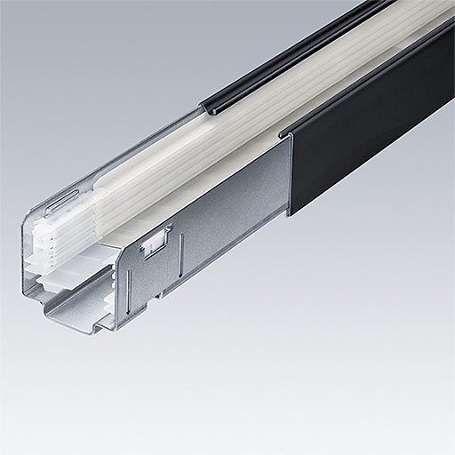 Roll-formed sheet steel trunking units powder coated with black polyester lacquer. 5 mains power lines (5 x 2.5mm²/16A) plus 2 x 2 conductors (4 x 1.5mm²/10A) for integrating emergency lighting using two independently isolated circuits, plus and 2 control-line conductors (2 x 1.5mm²/10A). Tool-free connection using electrical feed kit.