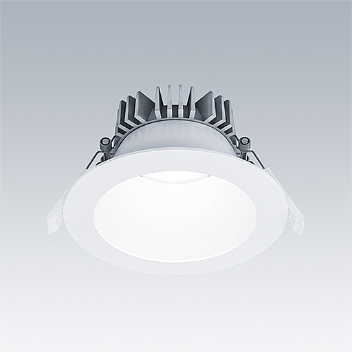 A low height, recessed LED downlight. Suitable for ceiling cut-outs Ø145-180 mm for easy refurbishments or fast initial installations. Remote, pluggable, Dimmable in steps LED driver. Loop in - loop out possible. Body: Die-cast aluminium for thermal management. Diffuser: polycarbonate, smooth reflector in white finish with wide beam. Reflector and trim: high quality, highly reflective polycarbonate. Class II electrical, IP20. Spring clips suitable for ceiling thicknesses from 1 to 35 mm.