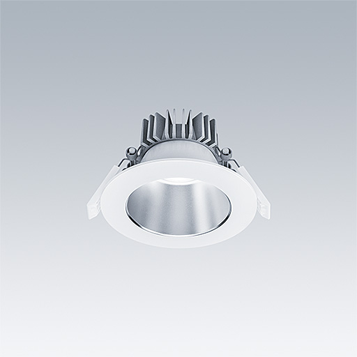 A low height, recessed LED downlight. Suitable for ceiling cut-outs Ø95-125 mm for easy refurbishments or fast initial installations. Remote, pluggable, DALI dimmable LED driver with DC functionality, adjustable 1-100 %, emergency power level preset to 15%, NFC configurable, SwitchDIM compatible. Loop in - loop out possible. Body: Die-cast aluminium for thermal management. Diffuser: polycarbonate, smooth reflector in satinbrite finish with wide beam. Reflector and trim: high quality, highly reflective polycarbonate. Class II electrical, IP44_IP20. Spring clips suitable for ceiling thicknesses from 1 to mm. Complete with 3000K LED