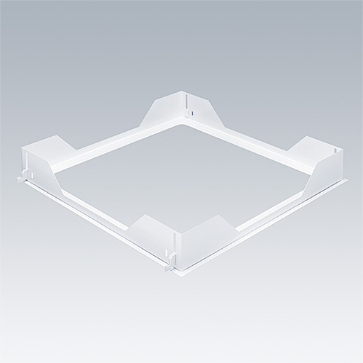 Recessing frame for mounting a 1197 x 297mm Omega Pro 2 luminaire in a plasterboard ceiling of 12-50mm thickness. Kit consists of sheet metal structure and height adjustable wedges adapting to different ceiling thicknesses. In order to install the product (including CKIT) within the frame comfortably and without damaging the optic, a void depth of 200mm and a border of 150mm around the cut out is recommended.