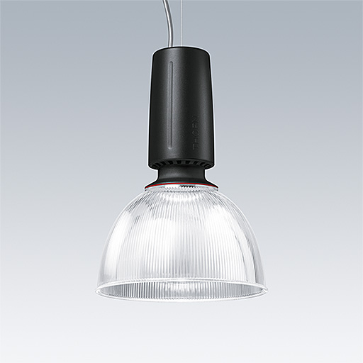 A modern and efficient LED pendant luminaire. DALI dimmable control gear with 3 hour, manual test, emergency lighting circuit. Housing: Die-cast aluminium with satin black finish. Reflector: prismatic polycarbonate with easy bayonet mount connection to housing. Class I electrical, IP20. Suspended via adjustable quick-lock 2.5m single wire suspension (supplied). Pre-wired with braided, flame retardent silicone cable, 6 x 0.75mm². Complete with 3000K LED