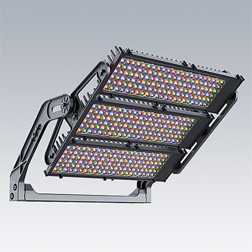 A high powered LED floodlight with optic 1: narrow beam; optic 2: narrow beam; optic 3: narrow beam light distribution from 396 LEDs. External control gear, supplied only by Thorn Lighting (maximum driving current 850mA) and wiring with H07 RN-F cable type with mini diameter 13mm, to be ordered separately. Class I electrical, IP66, IK08. Heatsink: Die-cast aluminium powder coated dark sandy grey (close to RAL 7043). Mounting bracket and frame: dark sandy grey (close to RAL 7043). Cover: 4mm clear glass. Bracket mounted using fixation points available (one M20 screw or two M14 screws). Low flicker operation (<1%) suitable for HDTV broadcasting. Luminaire with RGB light colours (red, green, blue, white), 4000 K, Ra > 90 Equipped with black PCB to reduce spill light.