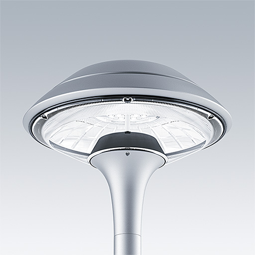 Plurio Direct: A decorative post-top LED lantern with radially symmetric distribution. LED driver with 18 LEDs driven at 350mA. Class II electrical, IP66, IK08. Base: cast aluminium, powder coated silver-grey. Canopy: flat shape, aluminium, textured silver-grey. Diffuser: UV stabilised, clear polycarbonate with anti-glare prisms. Direct, lens based optic with internal reflector. Equipped with 50% power reduction circuit, effective 3 hours before and 5 hours after a calculated midnight. It can be deactivated at installation with an easily accessible internal switch. Complete with 4000K LED. Post top mounting to Ø60mm column. Pre-wired with 4m cable.