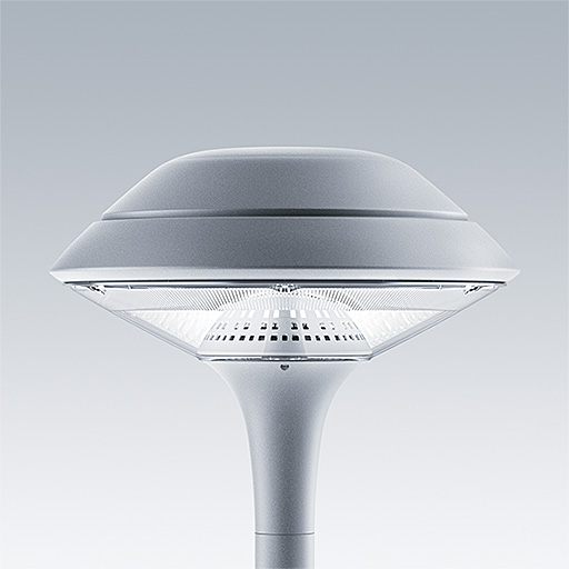 Plurio Indirect: A decorative post-top LED lantern with radially symmetric distribution. LED driver with 24 LEDs driven at 350mA. Class II electrical, IP66, IK08. Base: cast aluminium, powder coated light grey 150 (close to RAL9006). Canopy: flat shape, aluminium, textured light grey 150 (close to RAL9006). Diffuser: UV stabilised, clear polycarbonate with anti-glare prisms. Indirect, reflector based optic. Equipped with 50% power reduction circuit, effective 3 hours before and 5 hours after a calculated midnight. It can be deactivated at installation with an easily accessible internal switch. Complete with 2200K LED. Post top mounting to Ø60mm column. Pre-wired with 4m cable.