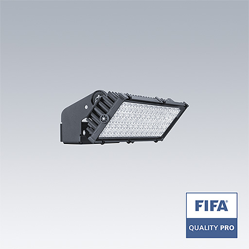 Projecteur LED haute puissance avec distribution lumineuse Optique 1 : faisceau étroit; de 168 LED. Appareillage externe, Fourni uniquement par Thorn Lighting, à commander séparément (courant de transmission maximum 1050 mA) et câblage via câble de type H07 RN-F et mini-diamètre de 13 mm. Classe électrique I, IP66, IK08. Dissipateur thermique : Moulage sous pression aluminium thermopoudré gris foncé (similaire à RAL 7043). Support de fixation et cadre : gris foncé (similaire à RAL 7043). Fermeture : 4 mm transparent verre. Fourche montée à l’aide des points de fixation disponibles (une vis M20 et deux vis M14). Fonctionnement à faibles papillotements (< 1 %) adapté à une diffusion TV haute définition. Livré avec LED 4 000 K