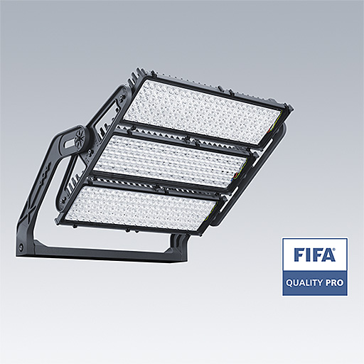 Projecteur LED haute puissance avec distribution lumineuse Optique 1 : faisceau étroit; Optique 2 : asymétrique 60°; Optique 3 : asymétrique 60° de 456 LED. Appareillage externe, Fourni uniquement par Thorn Lighting, à commander séparément (courant de transmission maximum 1050 mA) et câblage via câble de type H07 RN-F et mini-diamètre de 13 mm. Classe électrique I, IP66, IK08. Dissipateur thermique : Moulage sous pression aluminium thermopoudré gris foncé (similaire à RAL 7043). Support de fixation et cadre : gris foncé (similaire à RAL 7043). Fermeture : 4 mm transparent verre. Fourche montée à l’aide des points de fixation disponibles (une vis M20 et deux vis M14). Fonctionnement à faibles papillotements (< 1 %) adapté à une diffusion TV haute définition. Livré avec LED 4 000 K