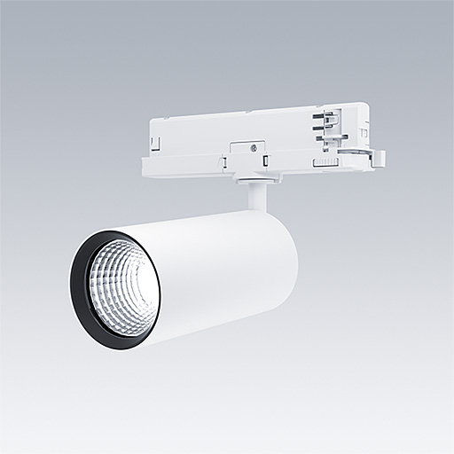 Projecteur LED pour installation sur rail triphasé avec distribution lumineuse de type projection et température de couleur stabilisée. Electronique, non gradable. Classe électrique II, IP20. Corps : aluminium Moulage sous pression, peinture microtexturée blanc. Réflecteur : PC poudré. Projecteur orientable sur le plan horizontal de 360° et inclinable sur le plan vertical de 90°. Livré avec LED 4 000 K