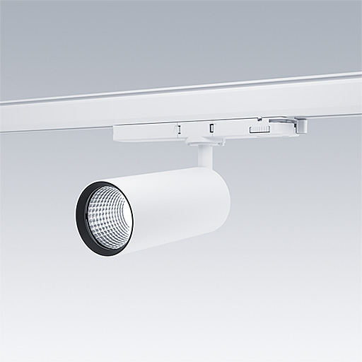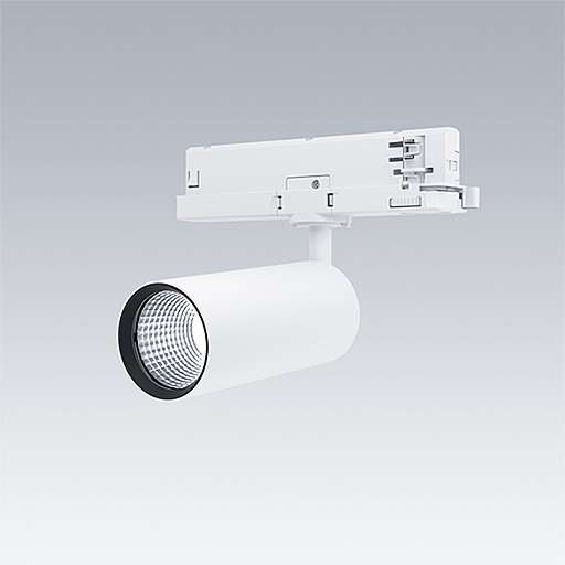 Projecteur LED pour installation sur rail triphasé avec distribution lumineuse de type spot et température de couleur stabilisée. Electronique, non gradable. Classe électrique II, IP20. Corps : aluminium Moulage sous pression, peinture microtexturée blanc. Réflecteur : PC poudré. Projecteur orientable sur le plan horizontal de 360° et inclinable sur le plan vertical de 90°. Livré avec LED 4 000 K